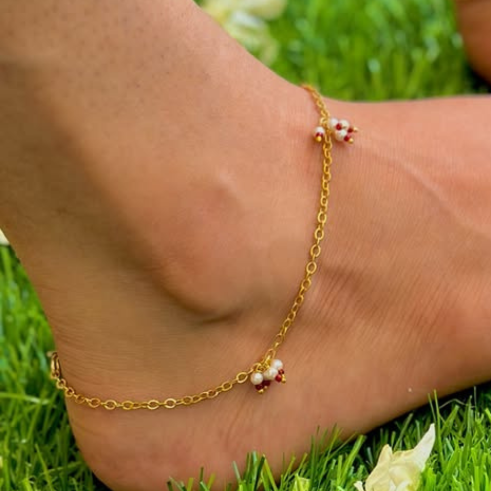 Ta delikatna złota bransoletka na kostkę ozdobiona jest pięknymi perłami i czerwonymi koralikami, które dodają elegancji Twojej nodze. Subtelny, kobiecy design sprawia, że jest to doskonały dodatek zarówno do codziennych, jak i bardziej eleganckich stylizacji. Idealna na ciepłe dni, świetnie komponuje się z sandałami lub na gołą stopę w stylu plażowym. Lekka konstrukcja zapewnia wygodę, a czerwone koraliki dodają wyrazistości. To subtelny, ale uroczy element, który podkreśli każdą stylizację i stanie się ulubionym dodatkiem w Twojej kolekcji biżuterii.
